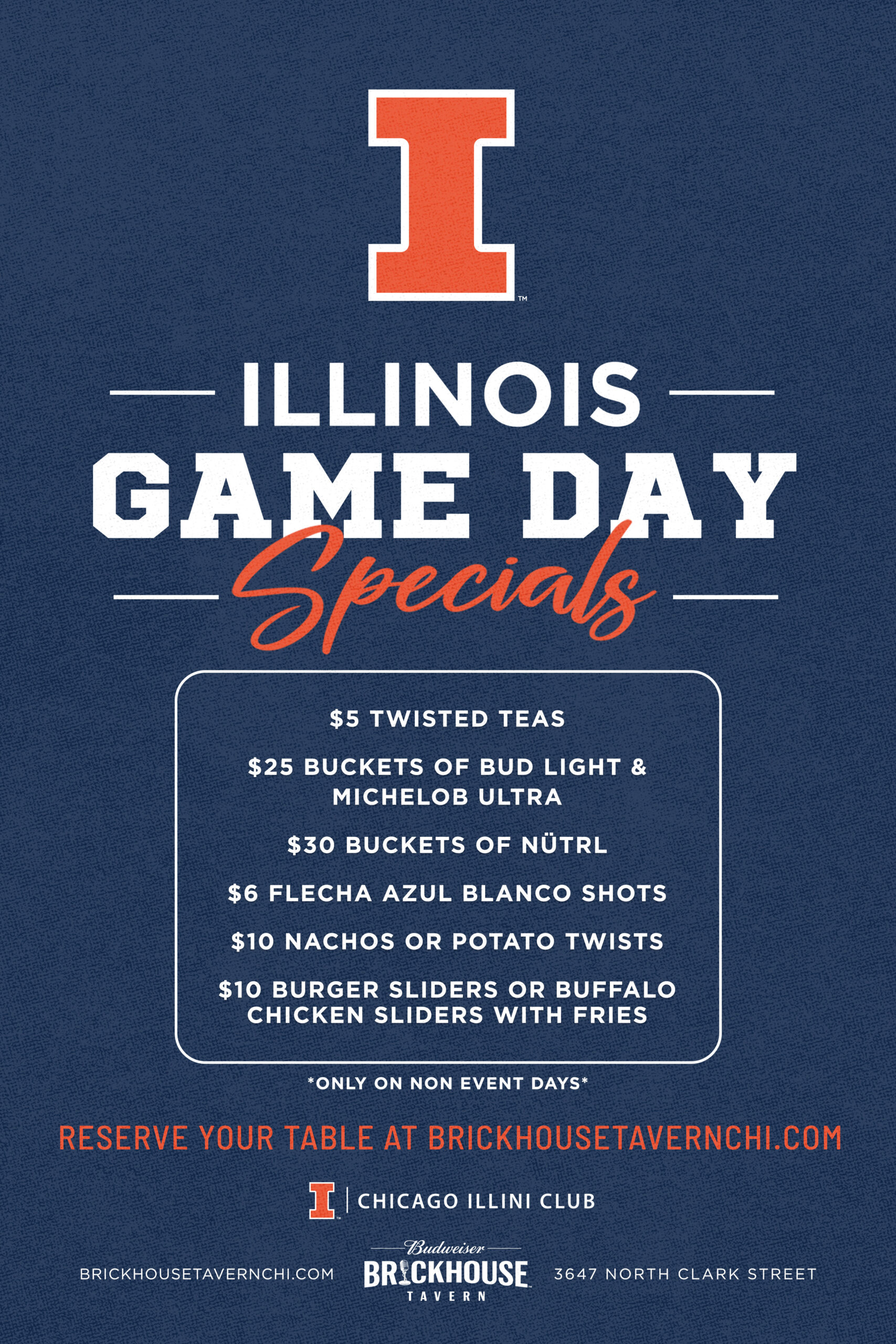 It’s Champaign North! Illini alumni and fans – join us at Budweiser Brickhouse Tavern and enjoy your Game Day Specials! We might not be on Green, but we’re your Illinois bar in Chicago.