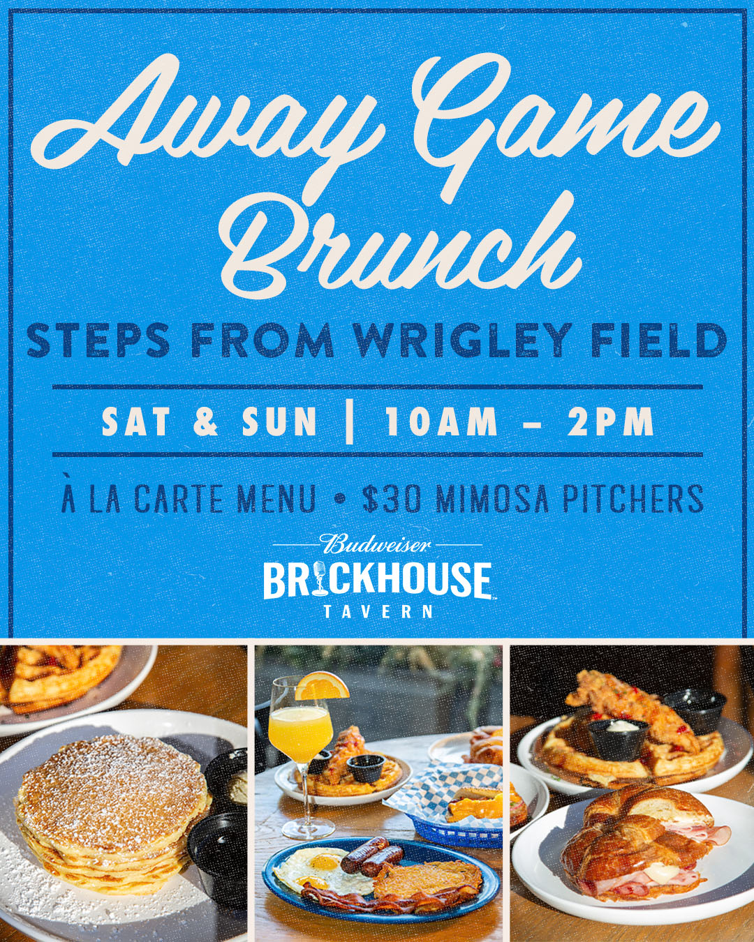 Away Game Brunch Let’s Brunch Wrigleyville! Join us for our new à la carte brunch menu at Brickhouse Tavern every Saturday & Sunday from 10am – 2pm when the Cubs are on the road! Reserve Your Table View Our Weekend Brunch Menu Away Game Brunch Saturday & Sunday, 10am – 2pm when the Cubs are on the road! Join us for our new à la carte brunch menu, $30 Mimosa pitchers, and handcrafted cocktails *only valid on away games + non-event days Reserve Your Table Book it! Book Your Next Event With Us! Book your next party at Budweiser Brickhouse Tavern! Outside of being located right next to the famous Wrigley Field, we offer two levels with four full bars, a state of the art A/V, DJ booth and stage. Book Your Party Today!